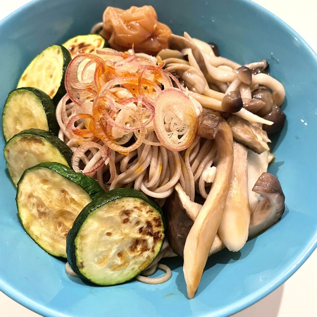 @giri20dai夏そば🌻幸。みょうがズッキーニきのこ梅干しラー油ちょっとがけ